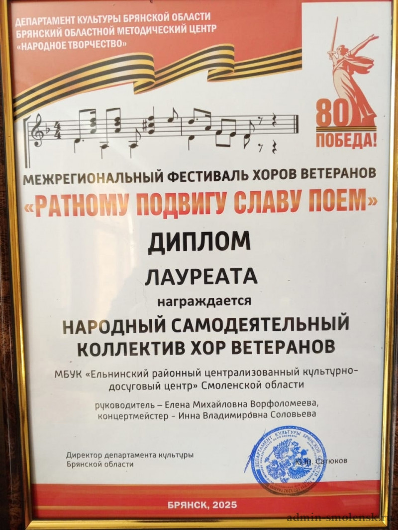 25 сентября наш народный коллектив хор ветеранов с руководителем Еленой Ворфоломеевой и концертмейстером Инной Соловьевой побывал во Дворце культуры БМЗ Брянского областного методического центра «Народное творчество», где состоялся Межрегиональный фестиваль хоров ветеранов «Ратному подвигу славу поем», посвященный Году Защитника Отечества и 80-й годовщине Победы в Великой Отечественной войне 1941-1945 гг.