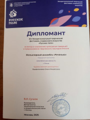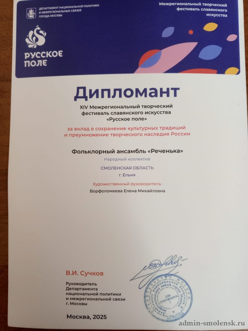 8 августа народный коллектив фольклорный ансамбль "Реченька", руководитель Елена Ворфоломеева, принял участие в финале XIV Межрегионального творческого фестиваля славянского искусства "Русское поле" в г. Москве в Концертном зале «Измайловский». Данный фестиваль – богатство славянского искусства со всех регионов нашей огромной страны.